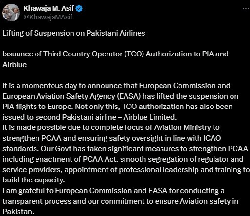The announcement stemmed from his discussions with relevant authorities. On Wednesday, he shared on X, “It is a momentous day to declare that the European Commission and EASA have lifted the suspension on PIA flights to Europe.” He also noted that EASA has granted Third Country Operator authorization to Airblue.