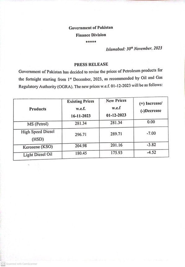 Caretaker Prime Minister Anwaar-ul-Haq Kakar approved the new fuel prices which will be effective from Thursday midnight and remain in place till December 15.