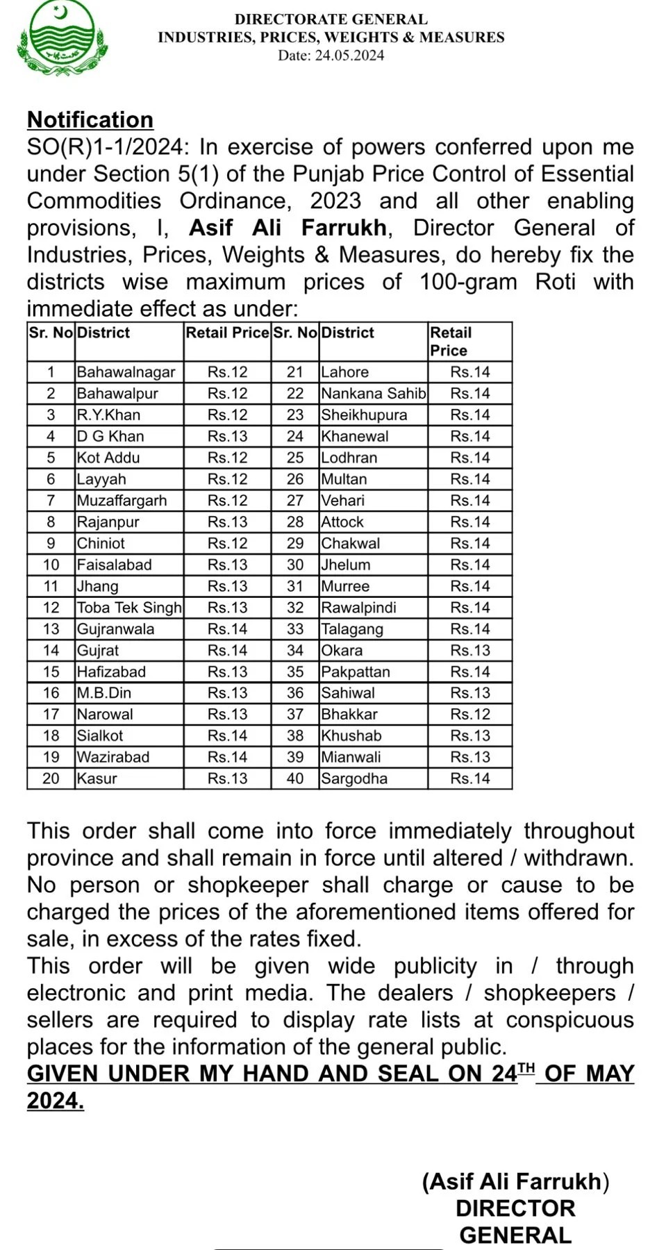 The new pricing scheme sets the price of roti at Rs14 in multiple regions, including Lahore. In other areas such as Bahawalpur and Bahawalnagar, the price has been set even lower, at Rs12.