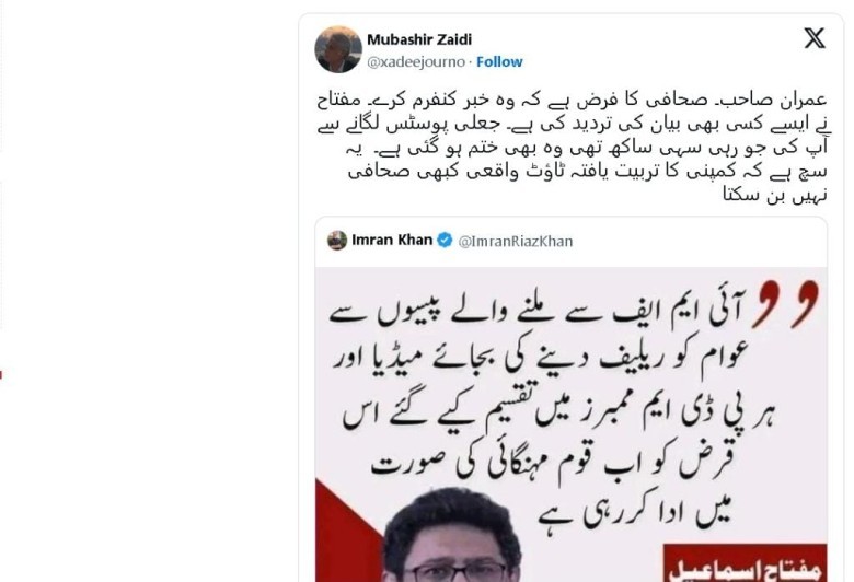 Reacting to Riaz's post, Mubashir Zaidi wrote on his X account that Imran Sahib. The journalist must confirm the news. Miftah Ismail has denied any such statement.