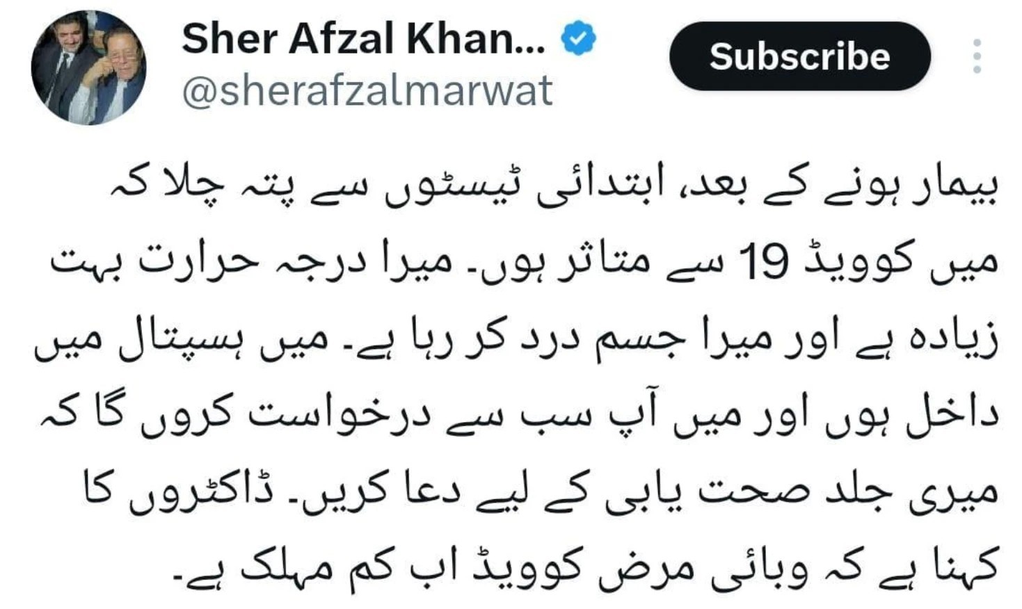 Pakistan Tehreek-e-Insaf MNA and senior leder Sher Afzal Marwat has contracted coronavirus..