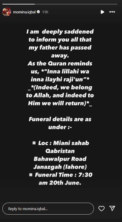 Renowned actress Momina Iqbal has shared the sad news that her father has passed away on Wednesday night.