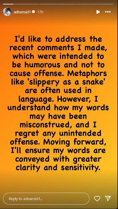 Taking to Instagram story, Siddiqui said that his remarks intended to be light-hearted were misinterpreted, expressing regret for any unintended offense.