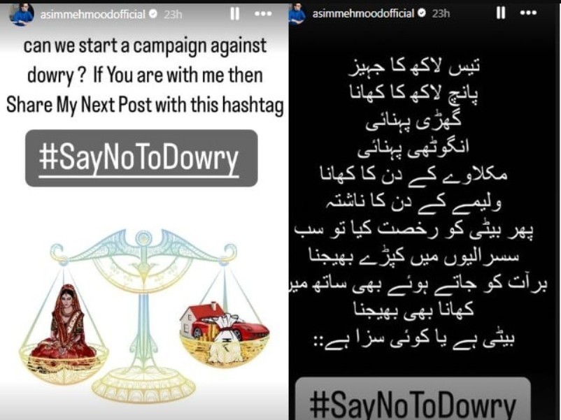 Taking to Instagram stories, the Piyari Nimmo star raised his voice against dowry, a trend in the country that pushed the bride's family into a burden of inessential expenses.