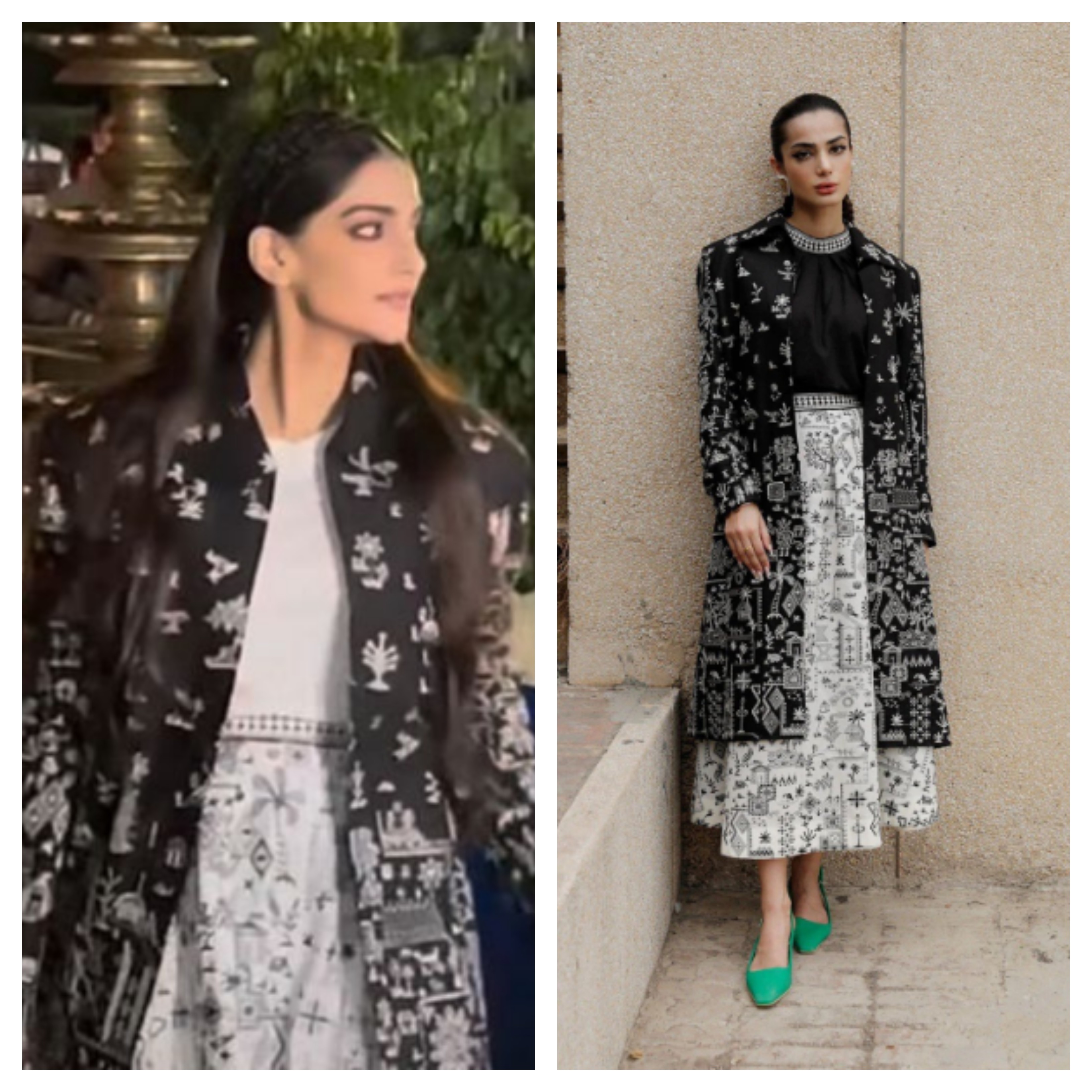 Sonam Kapoor wore a voguish outfit from Pakistani designer Hussain Rehar's "Jugnu Lahore '' collection. The outfit, originally named "Eclipse", featured a black embroidered top and a flowing white skirt with black detailing. It was completed with a black embroidered trench coat. Sonam gave the outfit her own personal touch by choosing a plain white top instead of the original halter neck design.