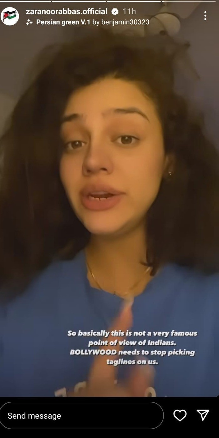 Zara Noor Abbas vehemently criticised the production of such films on her Instagram story. She highlighted the illogical nature of portraying scenarios “where neither Pakistan nor India can occupy each other,” emphasising “Kashmir's right to an independent state.” She remarked that “while one can foster love through art, the influence of Narendra Modi prevents Bollywood from doing so.”