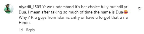 Another comment read, “After all this time, the name is Dua? Why? Are you guys from an Islamic country, or have you forgotten that you are Hindu?”