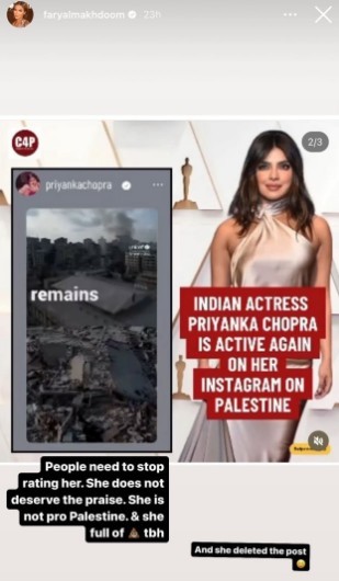 Reposting a story initially shared by the Bollywood actor, which Chopra later deleted, Makhdoom commented, “People need to stop rating her. She does not deserve the praise.”