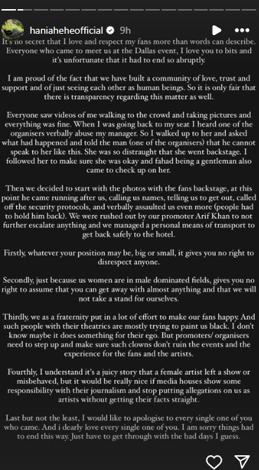 Renowned actor Hania Aamir broke her silence about the backstage altercation in Dallas that led to her abrupt departure from a meet-and-greet event, leaving many fans disappointed.