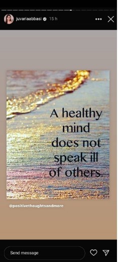In response, Juvaria Abbasi shared a cryptic message on her Instagram story: “A healthy mind does not speak ill of others.”