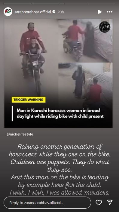 Renowned Pakistani actress Zara Noor Abbas expressed her frustration over an alarming increase in cases of sexual harassment in the country's biggest city, Karachi.