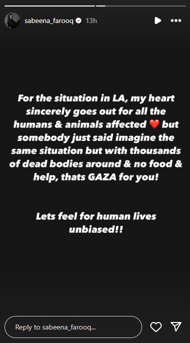 Taking to her Instagram story, Sabeena Farooq shared her thoughts on the two ongoing global crises, acknowledging that while the severity and context of each differ, there are undeniable similarities between them.