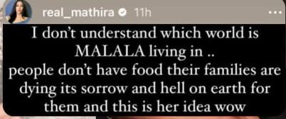 "I don't understand which world is Malala living in.. people don't have food, their families are dying, it's sorrow and hell on earth for them and this is her idea wow," she wrote.