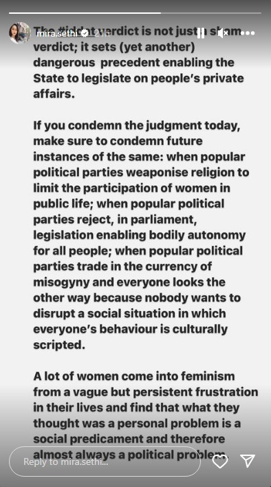 “The #iddat verdict is not just a sham verdict; it sets yet another dangerous precedent enabling the state to legislate on people’s private affairs,” her Instagram story read.