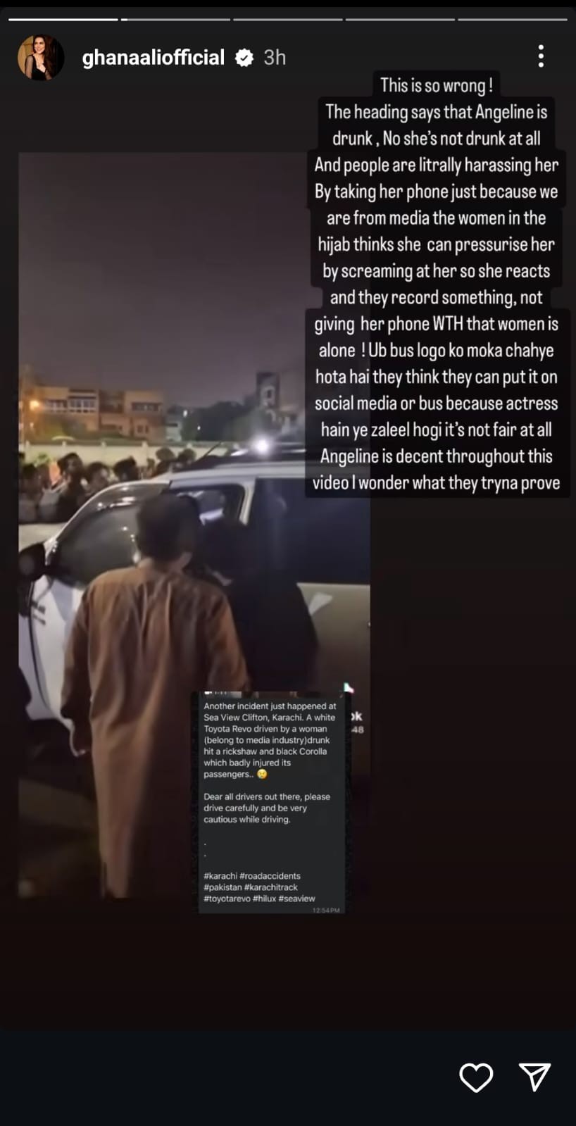 Actress Ghana Ali defended Angeline Malik following a car crash involving two vehicles after a tire burst at Sea View in Karachi. Ali criticised the mistreatment Malik received from the crowd, despite the fact that she was not attempting to escape.