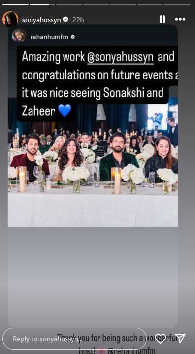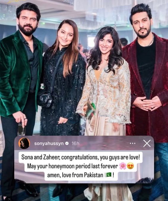 “Sona and Zaheer, congratulations. You guys are love,” Sonya wrote on her Instagram story. She added, “May your honeymoon period last forever, amen. Love from Pakistan.”