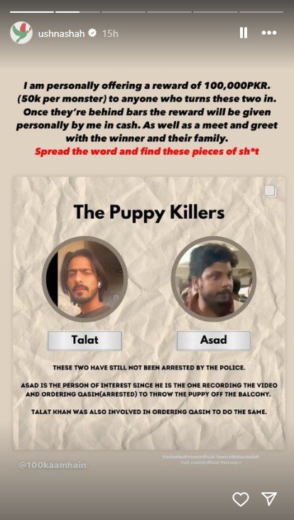 “I am personally offering a reward of 100,000 PKR (50k per monster) to anyone who turns these two in. Once they are behind bars, the reward will be given personally by me in cash," her Instagram story read.