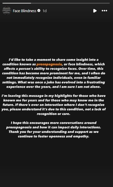 "I hope this encourages more conversations around prosopagnosia and how it can impact daily interactions. Thank you for your understanding and support as we continue to foster openness and empathy," she concluded.