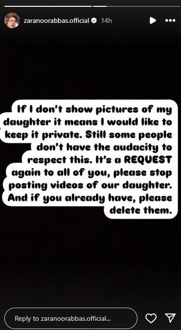 Taking to Instagram, Zara Noor Abbas shared a post condemning the invasion of her family's privacy. She criticized individuals who had been sharing photos of her daughter without the family's consent.