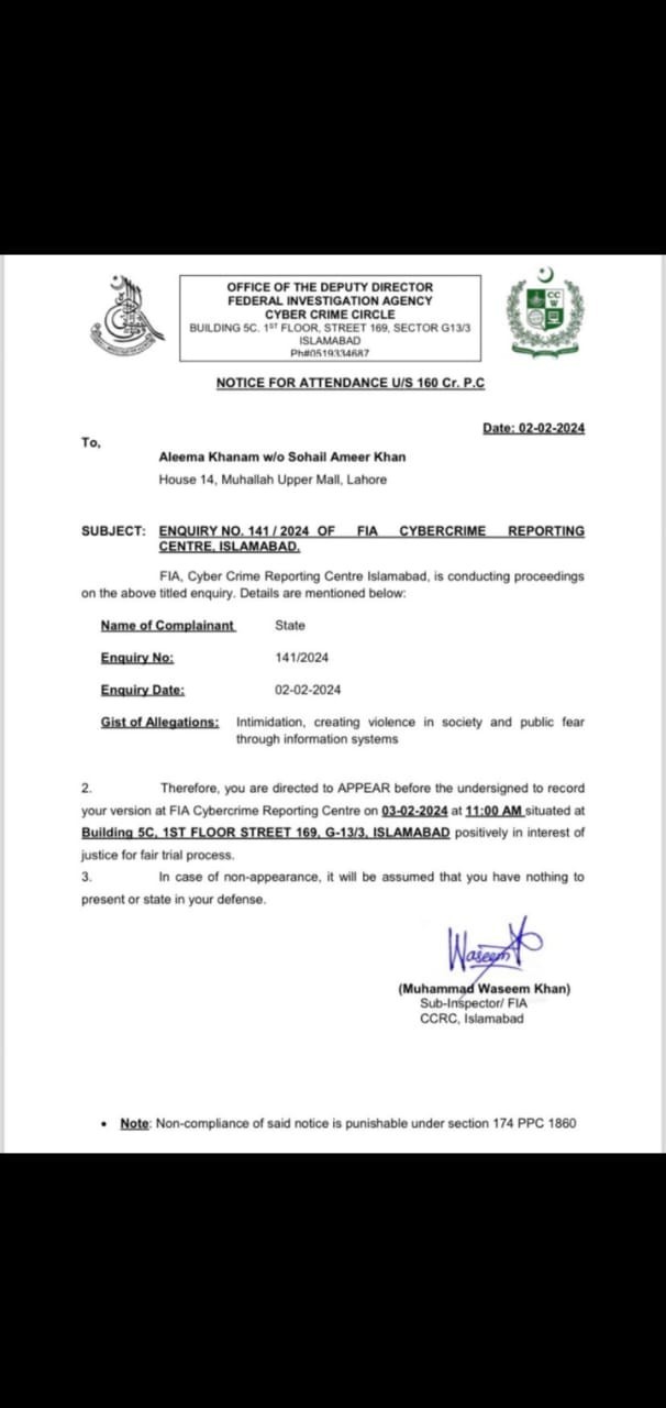 In case, Aleema Khan doesn’t appear before the FIA, the investigation authority will consider that she has nothing to state in her defense.