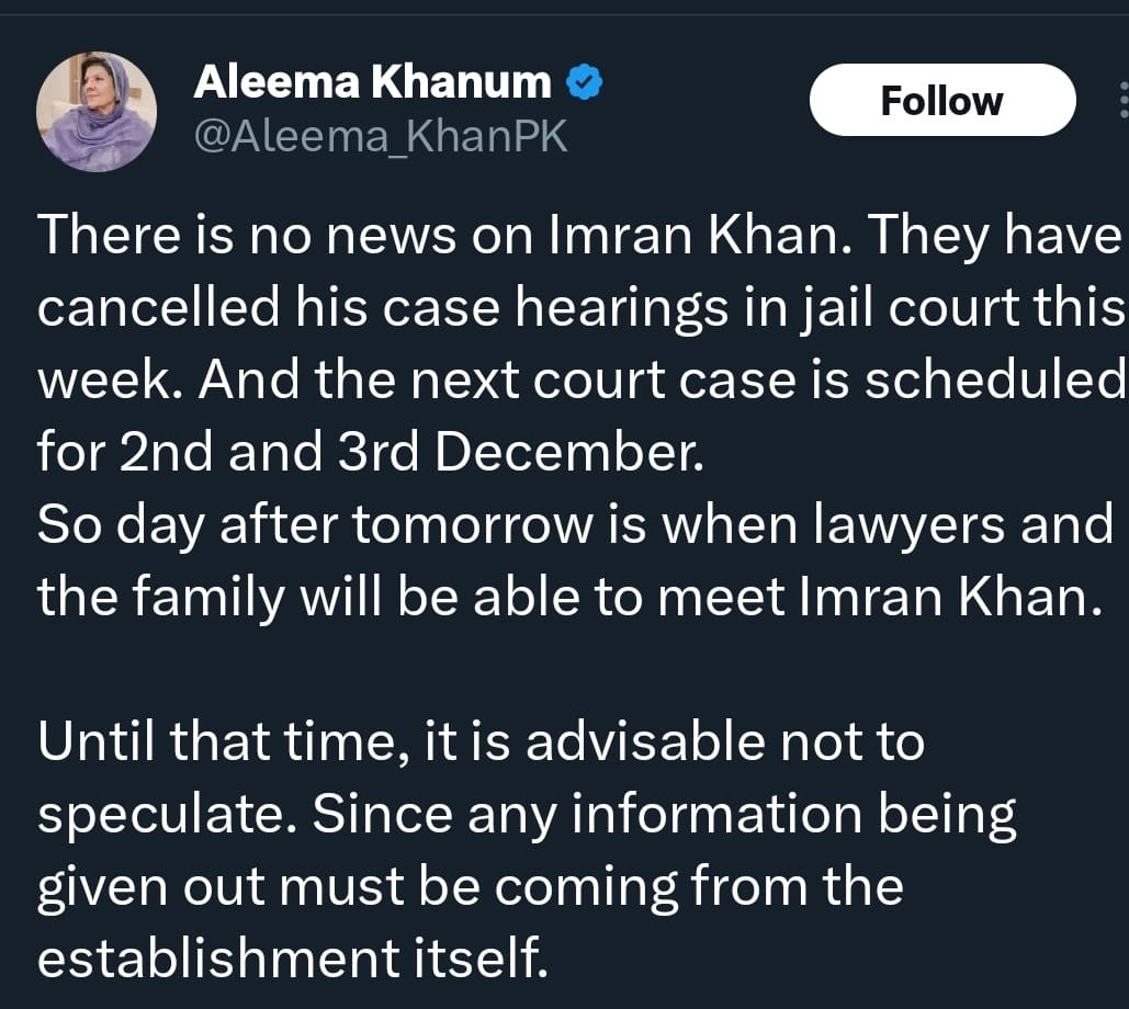 "Imran Khan’s scheduled jail court hearings for this week have been canceled, with the next sessions now set for December 2 and 3. Family members and lawyers are expected to meet him in jail the day after tomorrow, providing an opportunity for direct communication," she said.