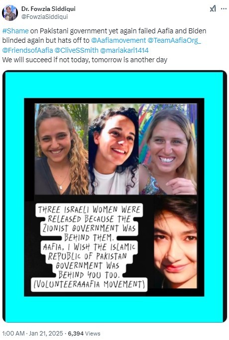 In another post, Dr Fowzia compared the efforts made by Israel and Hamas to free their hostages, criticising the Pakistani government for falling short in facilitating Dr Aafia’s return to her home country.