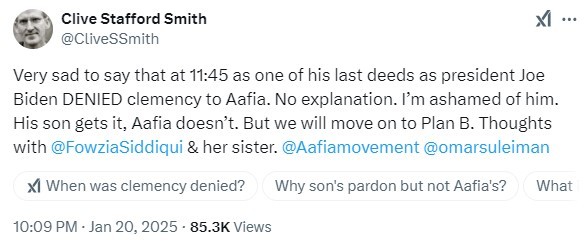 Aafia’s lawyer, Clive Stafford Smith, also lashed out at President Biden for ignoring Aafia’s clemency petition while granting pardons to others. However, he expressed determination to “move to Plan B” and continue his efforts to secure Dr Aafia’s release.