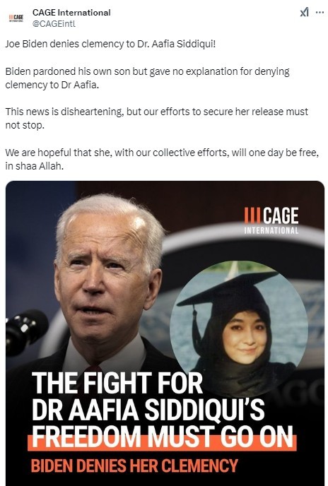 The advocacy organisation CAGE International also voiced its concern over Dr Aafia’s imprisonment, criticising the Biden administration for disregarding her clemency petition without providing any explanation.