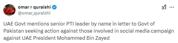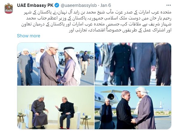 No statement regarding the social media campaign against CM Maryam or the Emirati President has been shared on the UAE embassy's official X account. Instead, the account recently posted images of Sheikh Mohamed bin Zayed Al Nahyan’s visit to Rahim Yar Khan, where he was welcomed by Prime Minister Shehbaz Sharif.