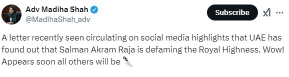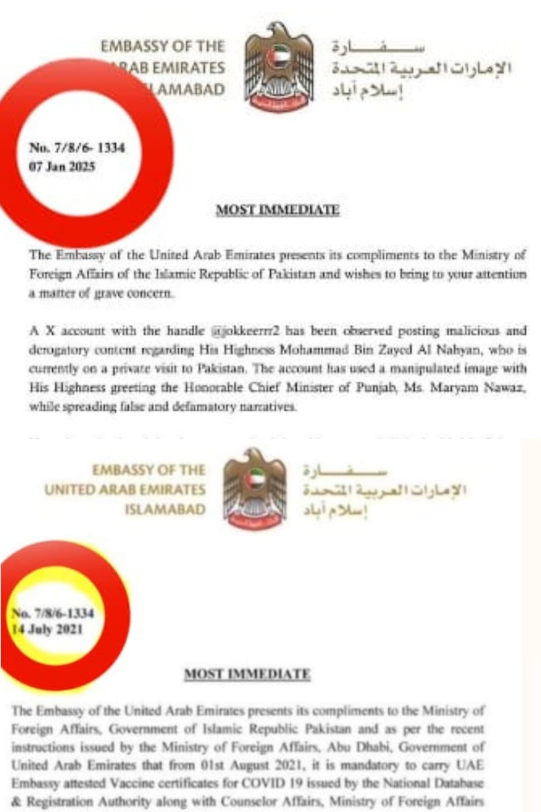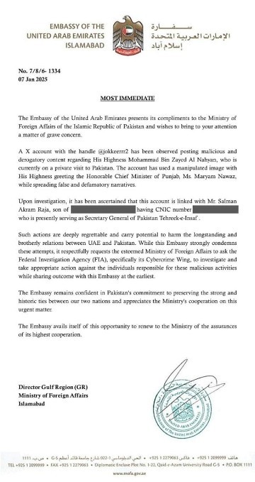 Dated January 5, 2025, the UAE Emabssy's letter mentions an X handle (@jokkeerrr2) accused of sharing a "manipulated" image of "His Highness greeting the Honorable Chief Minister of Punjab, Ms Maryam Nawaz."