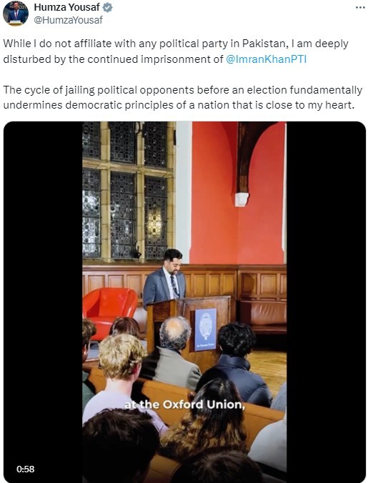 “Pakistan is a country that will forever be close to my heart, and while I am not affiliated with any political party,” he said, “the continuous cycle of jailing political opponents every time there is an election fundamentally undermines the democratic principles of that nation.”