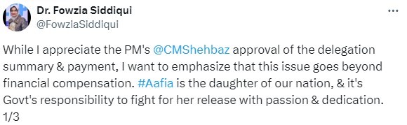 “Aafia is the daughter of our nation, & it's govt's responsibility to fight for her release with passion & dedication,” she wrote.