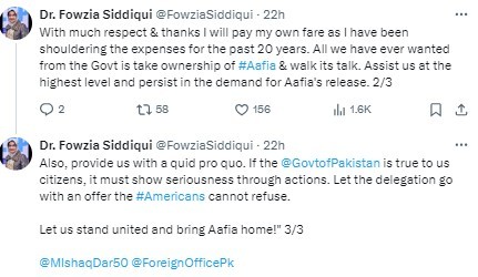 Dr Fowzia further stated that she has been bearing the expenses of her sister’s case for the past 20 years and is willing to continue doing so. However, she urged the government to “take ownership of Aafia” and expedite high-level efforts for her release.