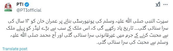 "History will remember that the greatest leader of this country was first unjustly sentenced for his love for the nation, and now, he is sentenced for his love for Prophet Muhammad (PBUH)," PTI stated on X.