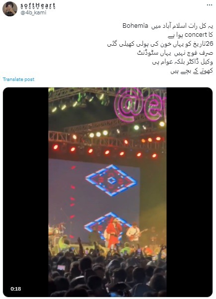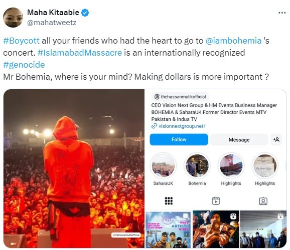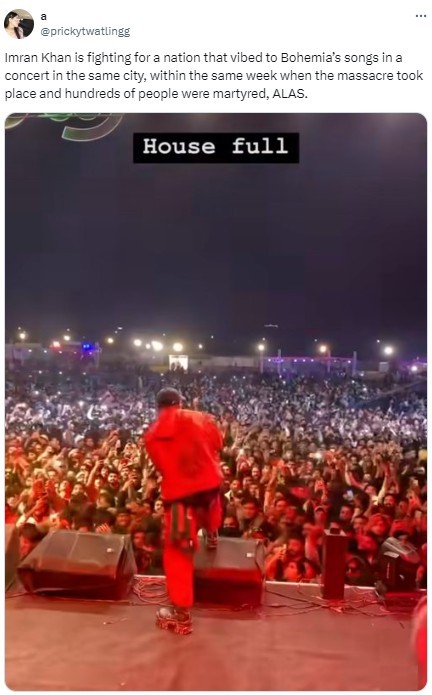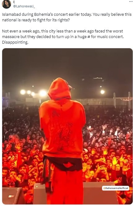 “Islamabad during Bohemia’s concert earlier today. You really believe this nation is ready to fight for its rights?” an outraged user wrote on X.