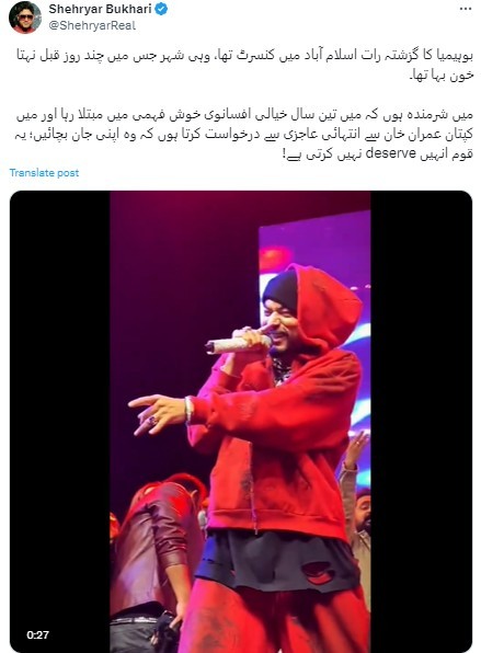 Pakistan Tehreek-e-Insaf (PTI) supporters expressed outrage at Islamabad residents for attending a concert by Pakistani-American singer Bohemia, accusing them of ignoring the alleged "massacre" of protesters on November 26.