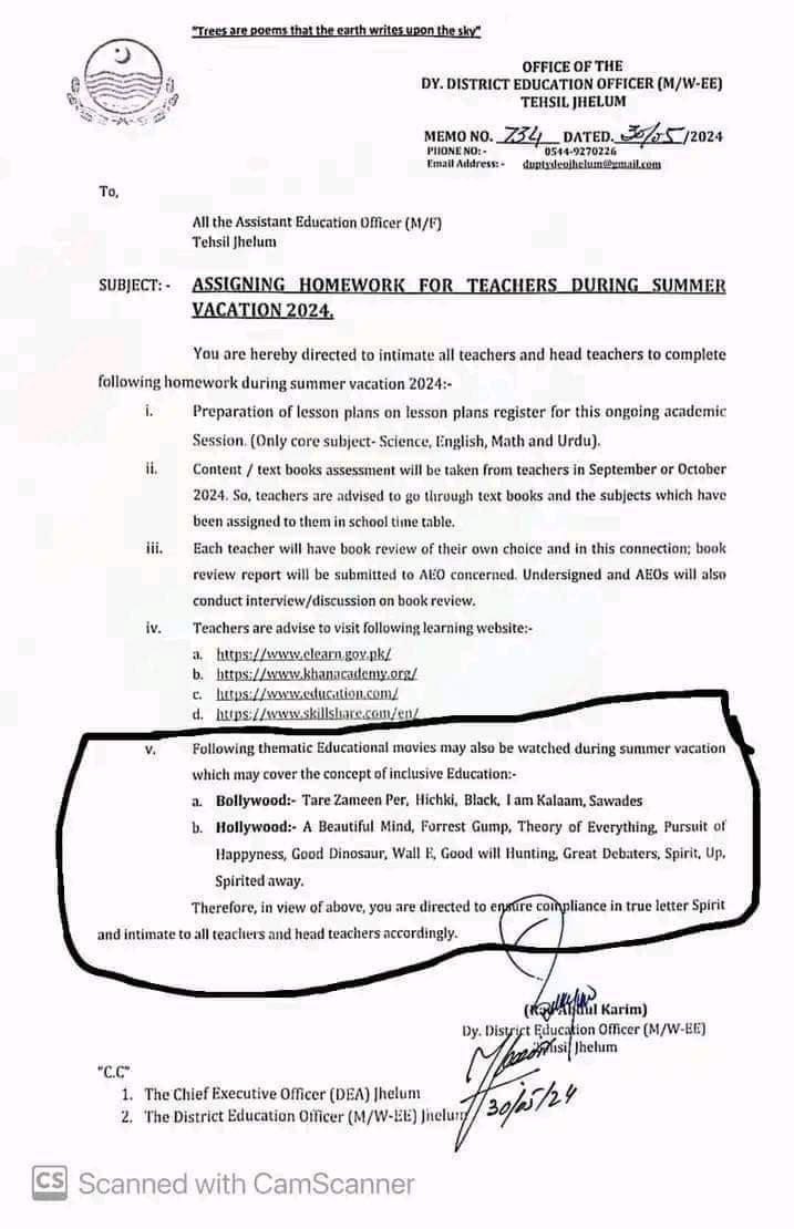 The District Education Officer (DEO) Jhelum, Rao Abdul Karim, has directed the teachers to watch Bollywood and Hollywood films as homework during the summer vacation break.
