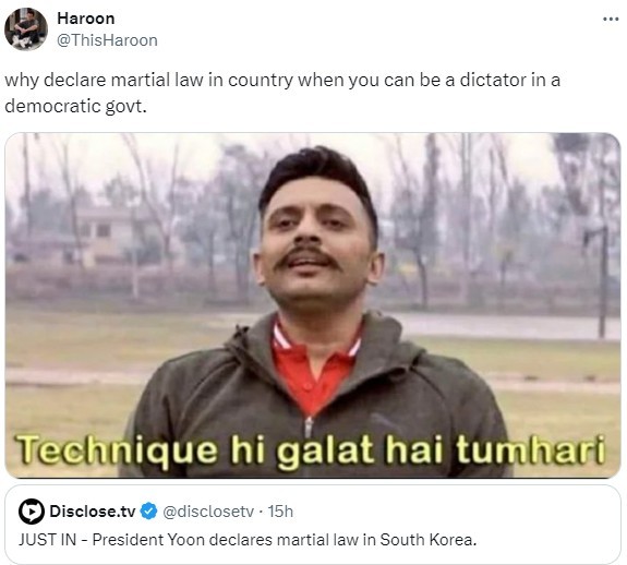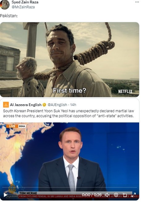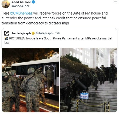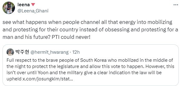 The swift reversal of martial law sparked widespread discussion on social media globally. Pakistani netizens, known for their active engagement with political developments on platforms like X, drew comparisons between South Korea's political upheaval and Pakistan's own challenges.