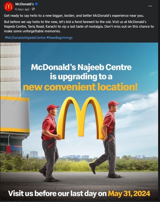McDonald's official Facebook page also confirmed the closure of their Tariq Road outlet. However, they mentioned relocating to a new location, without specifying the new address.