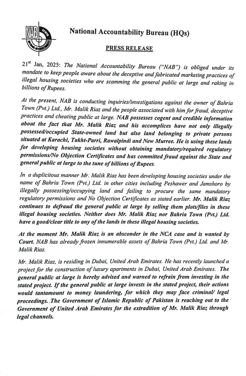 In its press release, NAB detailed ongoing investigations into Riaz and his associates for deceptive practices, including the illegal occupation of land and the development of unapproved housing societies under the Bahria Town name.