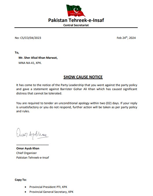 "It has come to the notice of the party leadership that you went against the party police and gave a statement against Barrister Gohar Ali Khan which has caused significant distress that cannot be tolerated," PTI said in a notice issued to Marwat.