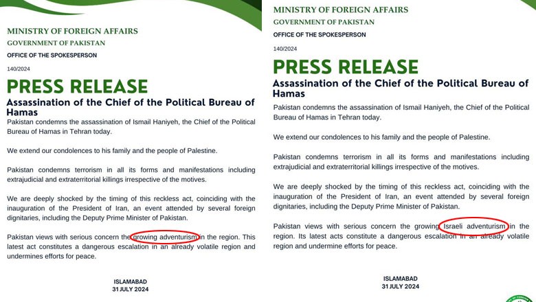Pakistan’s @ForeignOfficePk backtracks, quietly changes its statement on the condemnation of Ismail Haniyeh’s killing — Expunges the word ‘Israel’, replaces Israeli adventurism to just adventurism — Image 1, New changed statement — Image 2, Previous statement. https://t.co/0ochwX78JW pic.twitter.com/76hZzqCAGk