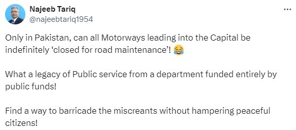 As a result, motorways leading to Islamabad have been completely closed to normal traffic, with diversions in place, such as directing vehicles to Thokar Niaz Baig and the Babusabu side. The motorways affected by these closures include: