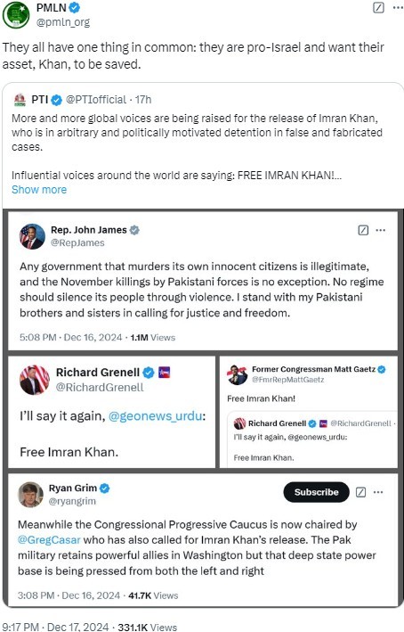 PML-N has frequently accused Khan and his party of seeking foreign support for their political interests, paritcularly from pro-Israel entities.