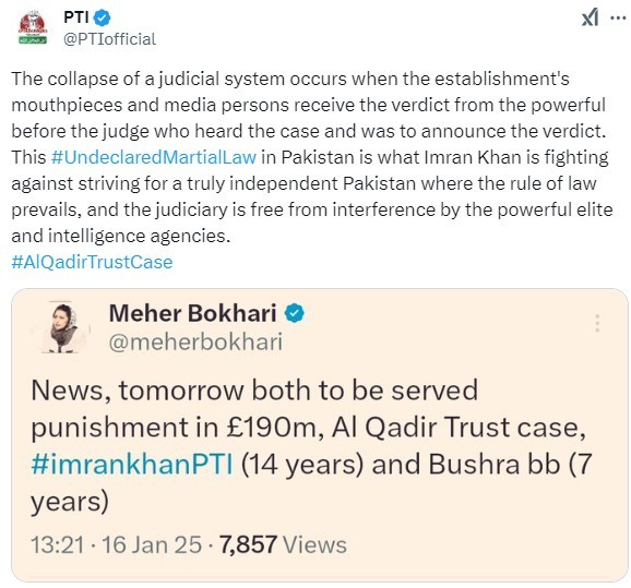 In a statement on X, PTI questioned the authenticity of the verdict, asking, “Imran Khan and Bushra Bibi were sentenced to the same punishment that 'tout journalists' and their sources had been mentioning. How did these journalists receive a copy of this unjust verdict before it was officially announced by the judge?”