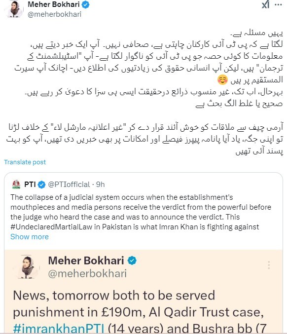 In response, PTI’s official X account condemned the journalist's post, accusing her of reflecting the flaws in Pakistan’s judicial system. PTI alleged that "establishment mouthpieces" were announcing verdicts before the judges themselves.