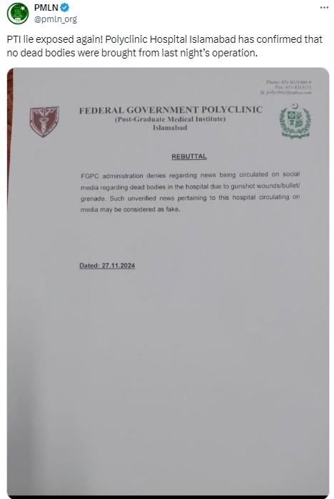 “PTI lie exposed again! Polyclinic Hospital Islamabad has confirmed that no dead bodies were brought from last night’s operation,” the PMLN stated.
