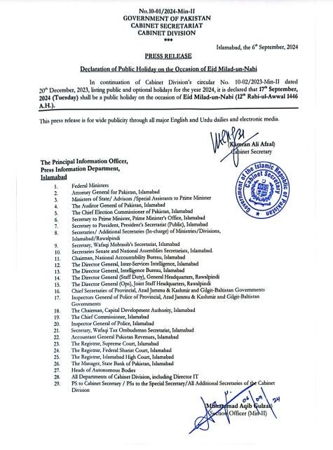 According to a notification issued by the Cabinet Division: "It is declared that 17th September, 2024, (Tuesday) shall be a public holiday on the occasion of Eid Milad-un-Nabi (12th Rabi ul Awwal 1446 AH)."