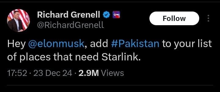 WASHINGTON: Richard Grenell, a close confidant of U.S. President-elect Donald Trump has made an appeal to Elon Musk, the owner of X (formerly Twitter), to include Pakistan in the list of countries eligible for Starlink services.