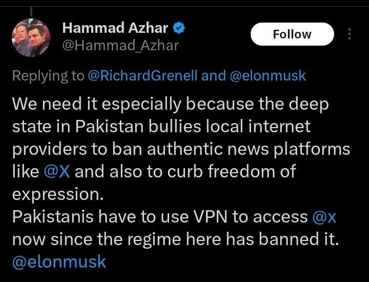 Hammad Azhar, a senior leader of Pakistan Tehreek-e-Insaf (PTI), responded to Grenell’s appeal, emphasizing the critical need for Starlink’s satellite internet in Pakistan.